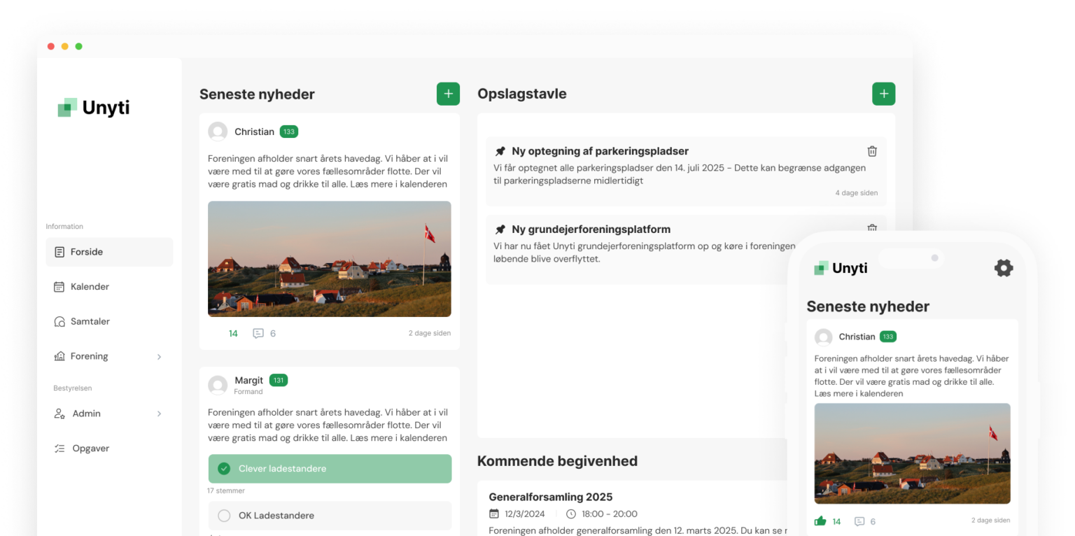 Med Unyti får foreningen adgang til alle de vigtigste funktioner samlet i ét sted, så I nemt kan håndtere drift, kommunikation og overblik i hverdagen.