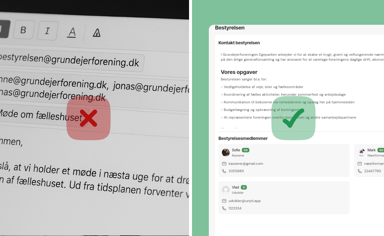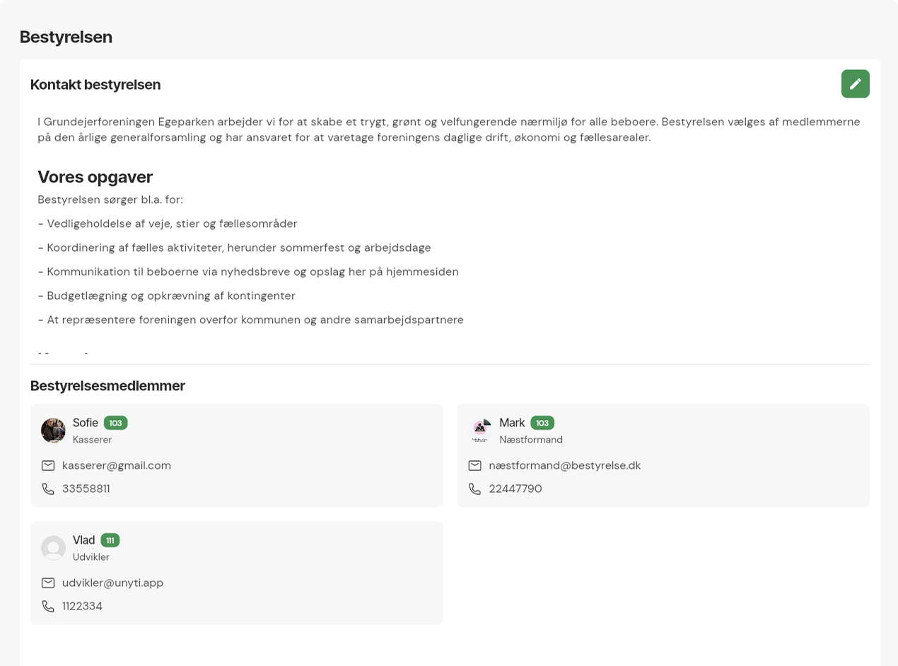 Det kan være svært at huske, hvem i bestyrelsen der er ansvarlige for hvad. Dette kan betyde, at medlemmer afholder sig fra at henvende sig med eventuelle spørgsmål. I Unyti Foreningsplatform kan medlemmer på få sekunder se, hvem som de skal kontakte. Bestyrelsessiden kan bruges af alle typer af foreninger, herunder: andelsboligforeninger og grundejerforeninger.