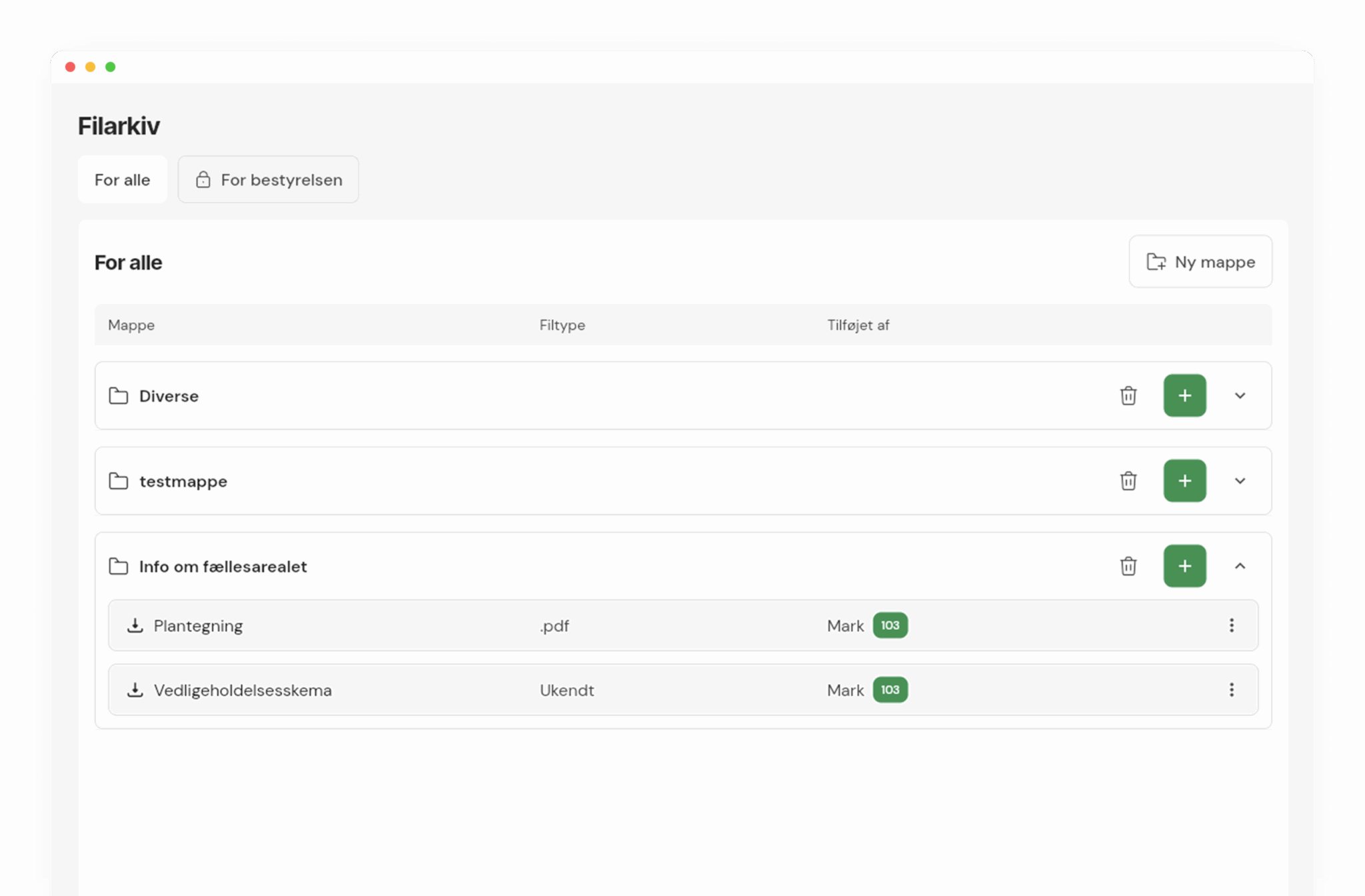 Del vigtige dokumenter og filer med foreningens medlemmer i et smart og brugervenligt filarkiv. Opret mapper og hold styr på alle de vigtigste informationer. Platformen har også et lukket filarkiv for bestyrelsen, hvor vigtige kontrakter og dokumenter kan gemmes digitalt.