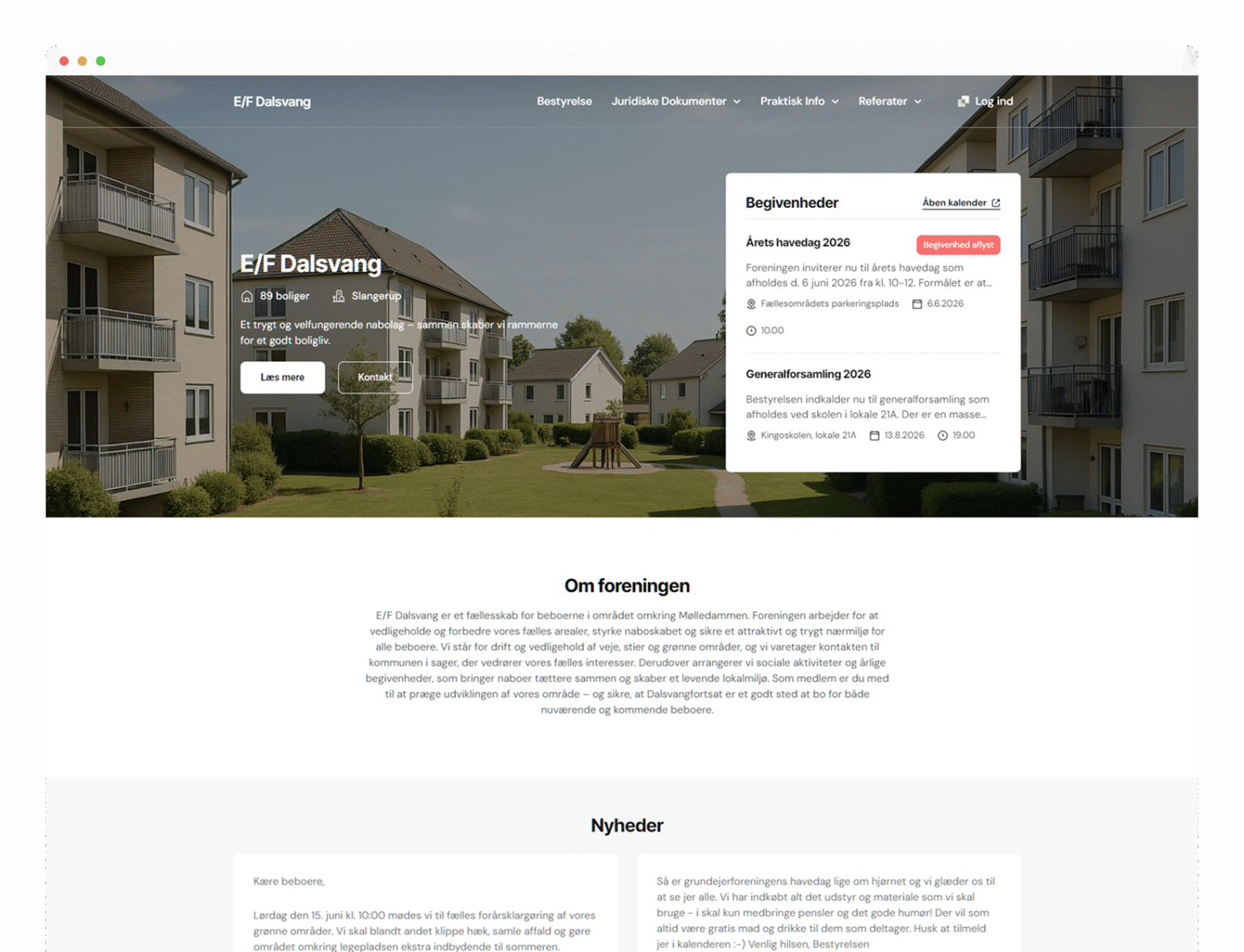 Unyti Foreningshjemmesiden synkroniseres med jeres grundejerforening i platformen. Det lyder måske lidt fancy, men det betyder kort sagt, at stort set alt i platformen også vises på hjemmesiden. Det vil sige, at i slipper for at lægge ting op to steder, og det sikrer samtidig at besøgende altid har de nyeste dokumenter.