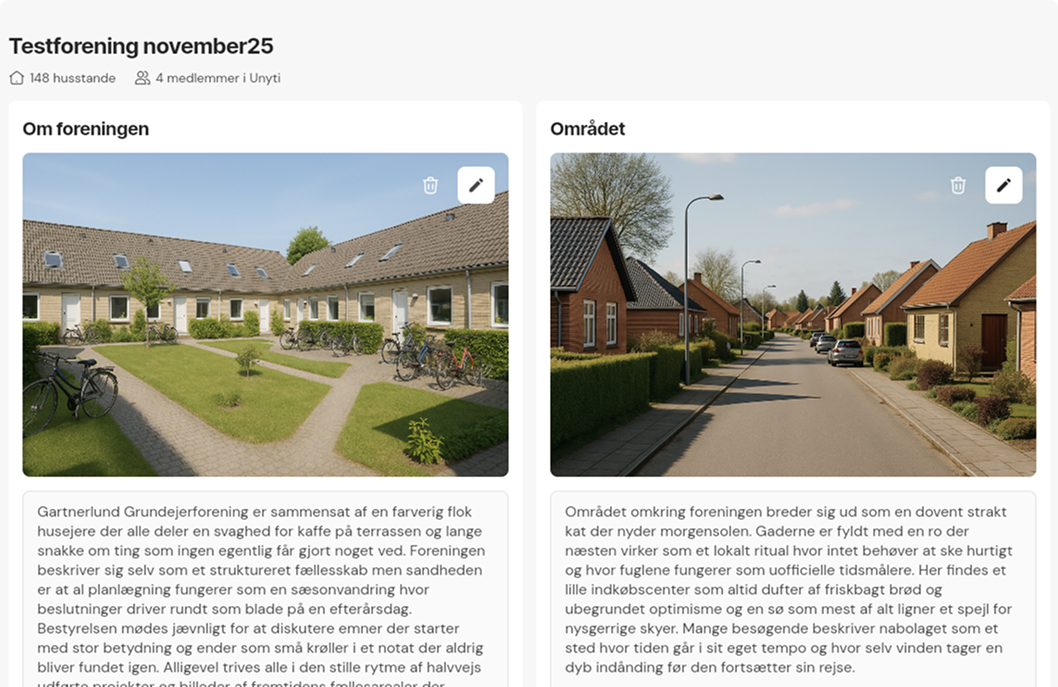 På denne side kan foreningen dele information om foreningens formål, historie og værdier samt fortælle lidt om området og fællesskabet.
