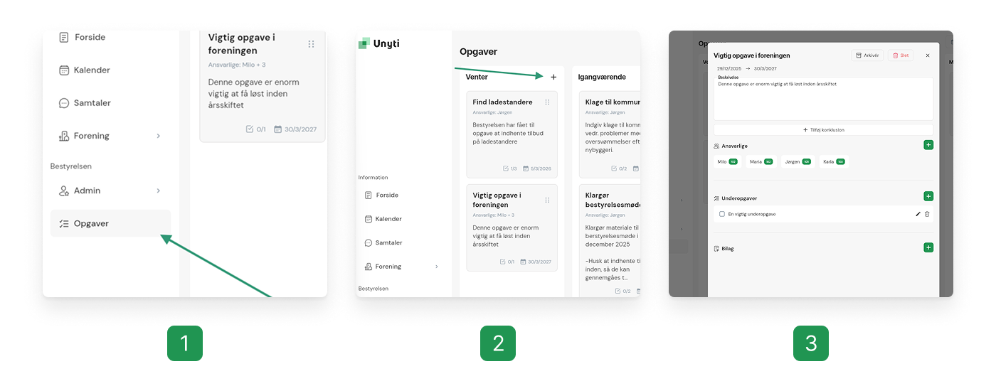 Opgaver kan oprettes, arkiveres eller slettes. Arkiverede opgaver findes via Arkiv knappen øverst til højre. Opgavesystemet er kun tilgængeligt for bestyrelsen og kan bruges både på web og i Unyti appen.