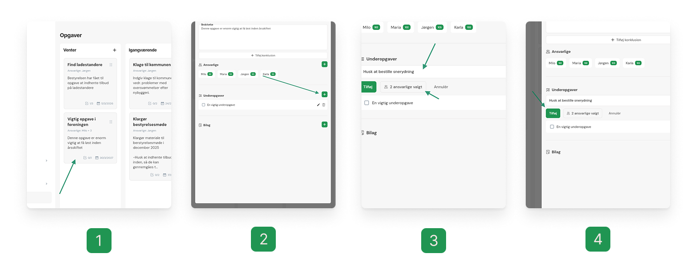 Nogle opgaver består af flere mindre delopgaver. Derfor kan du oprette underopgaver, som vises som en tjekliste under opgaven. Hver underopgave kan have en ansvarlig, så det er tydeligt, hvem der gør hvad.